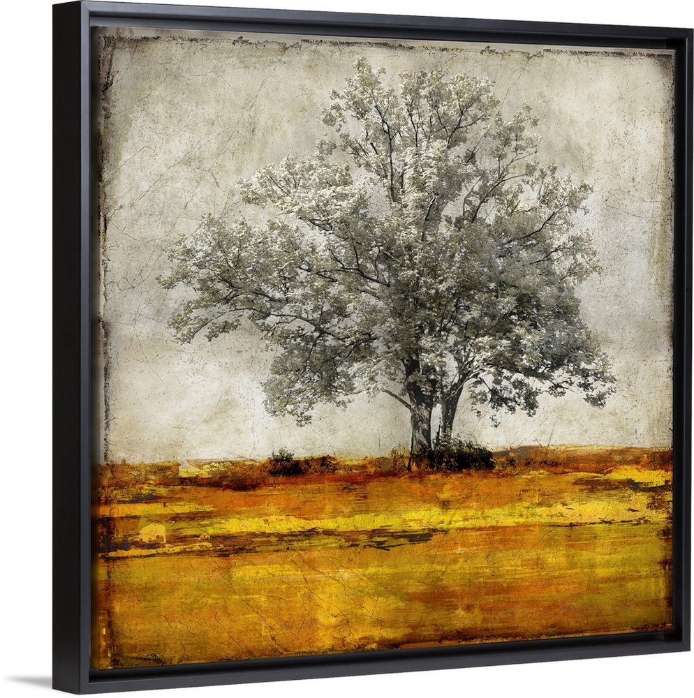 <p>Single gray scaled oak tree with a little bit of gold isolated on a distressed gray and white background with yellow and orange toned grass.</p>