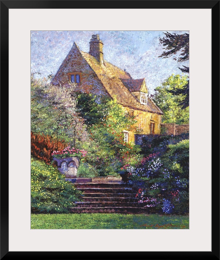 <p>Painting of a cottage with an extensive garden in the late afternoon sunlight.</p>