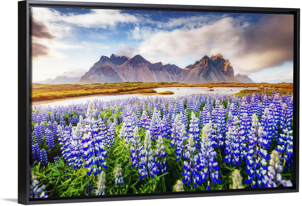 <p>Majestic lupine flowers glowing by sunlight. Stokksnes cape, Vestrahorn (Batman Mountain), Iceland, Europe.</p>