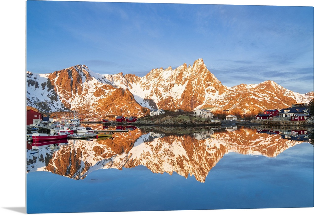 <p>Majestic mountains and fishing village reflected in the cold sea, Ballstad, Vestvagoy, Lofoten Islands, Norway, Scandinavia, Europe</p>