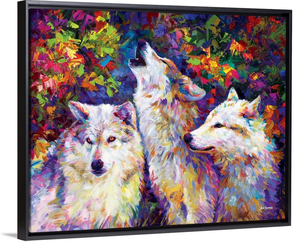 <p>Vibrant contemporary painting of three colorful wolves in the forest in the style of impressionism.</p>