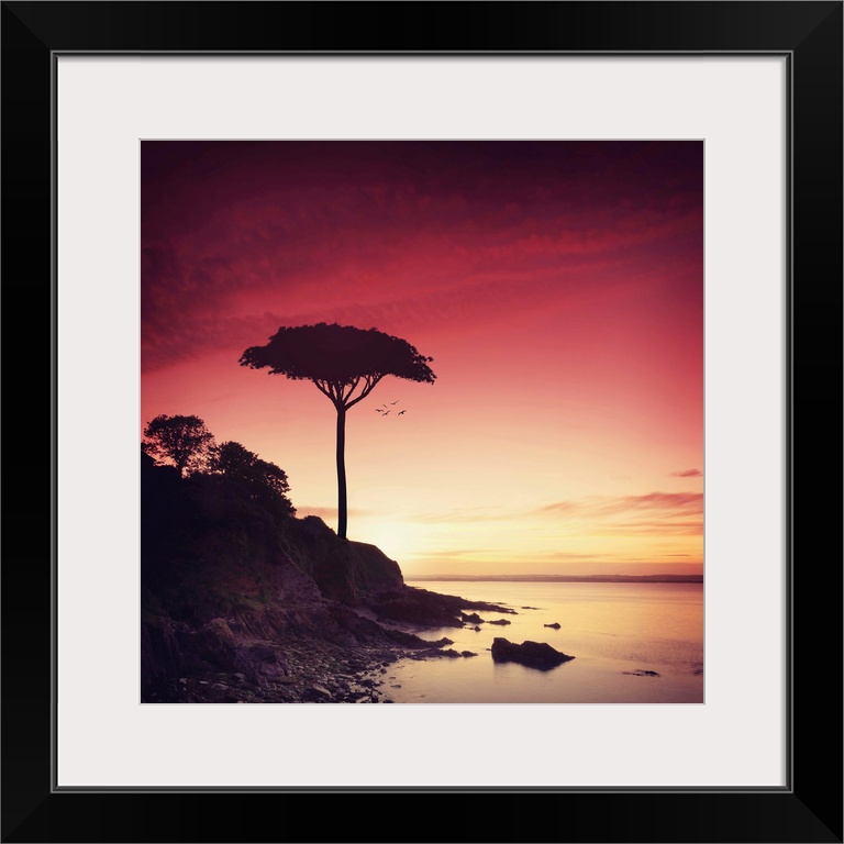 <p>Photograph of a silhouetted lone tree on a rocky shoreline at sunset.</p>