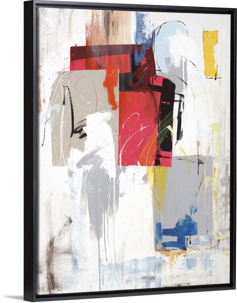<p>Large abstract artwork with bold shapes in the foreground with thin squiggly lines on top and white and gray hues in the background.</p>