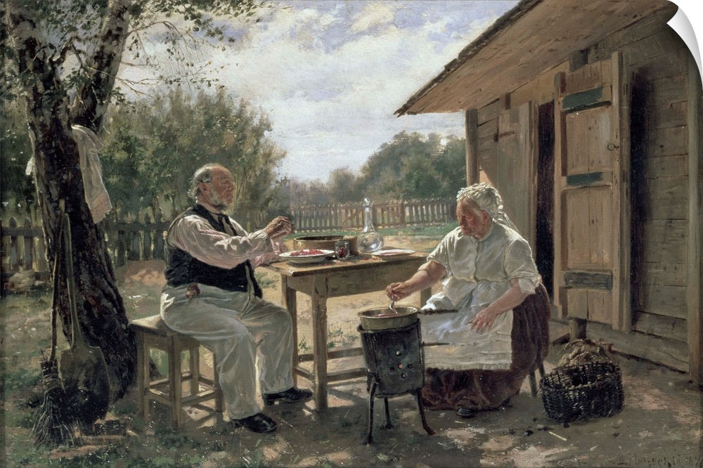 <p>XIR134971 Making Jam, 1876 (oil on canvas) by Makovsky, Vladimir Egorovic (1846-1920); 33.9x49.5 cm; Tretyakov Gallery, Moscow, Russia; (add. info.: La Preparation de la Confiture); Russian, out of copyright</p>