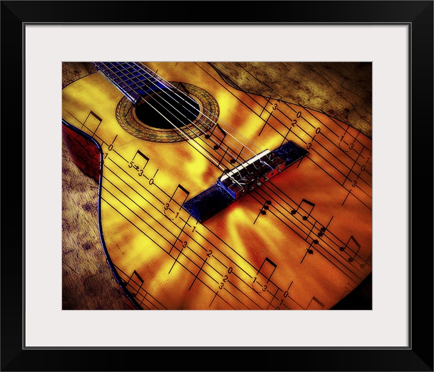 <p>Musical notation on the surface of an acoustic guitar.</p>