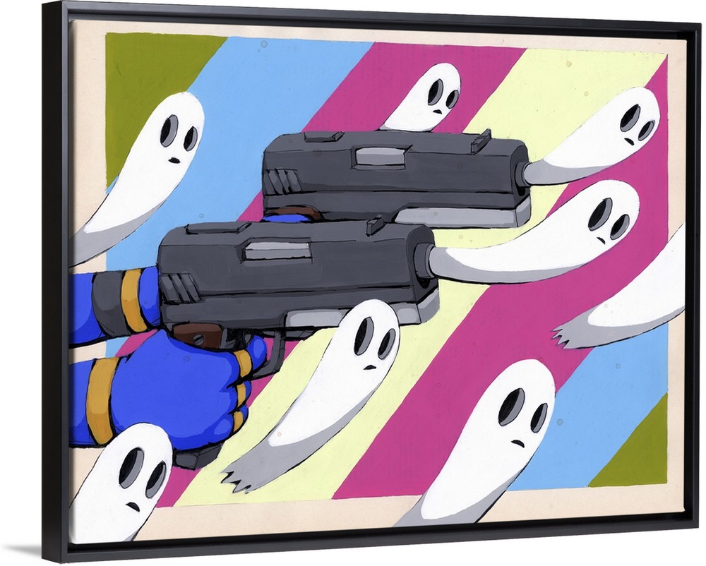 <p>Pop art painting of ghosts emerging from guns, symbolizing the destructive power of weapons.</p>