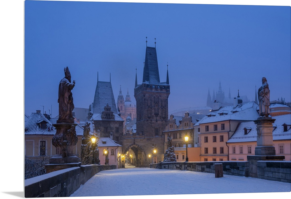 <p>Mala Strana Bridge Tower at snow-covered Charles Bridge at twilight in winter, Prague, Bohemia, Czech Republic. Prague, Central & Eastern Europe, Czech Republic.</p>