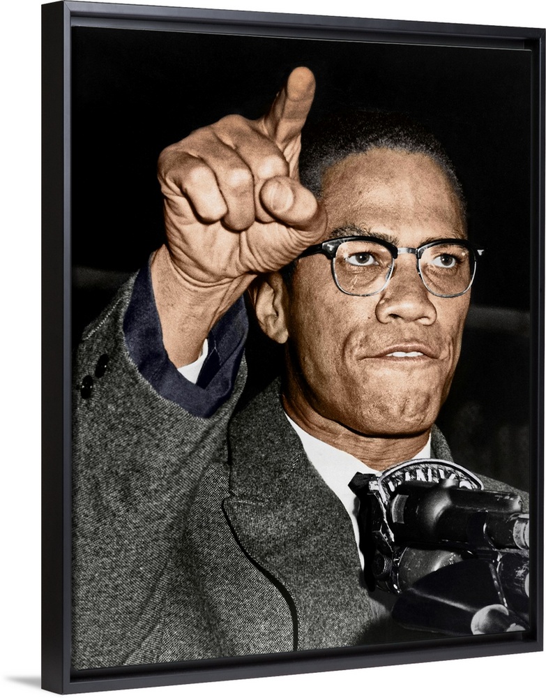 <p>MALCOLM X (1925-1965). Born Malcolm Little. American religious and political leader. Photographed while giving a speech at a rally in Harlem, New York City, c1963.</p>