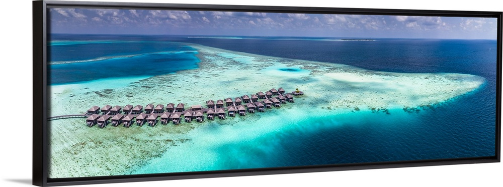 <p>Maldives, Ari Atoll, Indian ocean, South Alifu Atoll, breathtaking aerial view of Moofushi reef and the suspended houses in the middle of a transparent sea full of corals.</p>