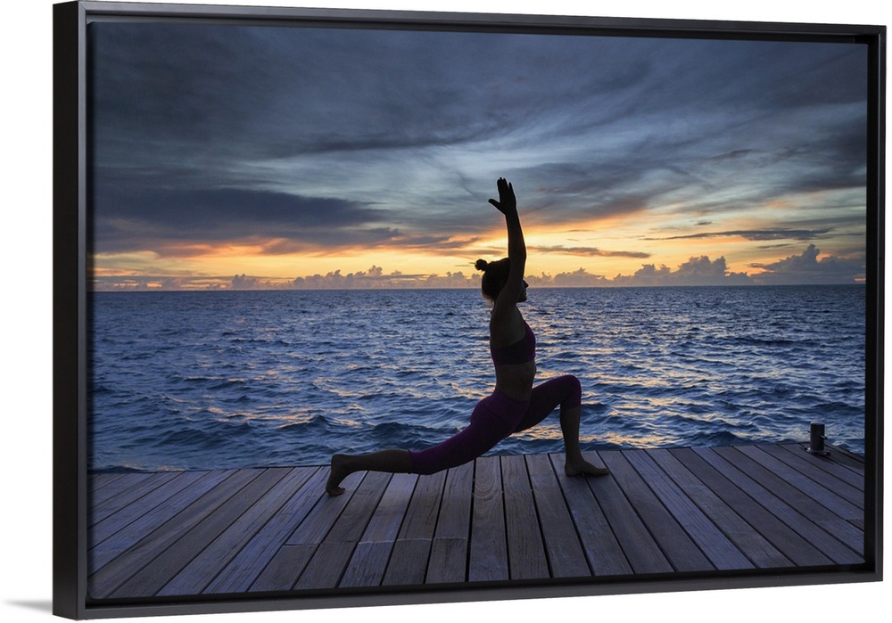 <p>Maldives, South Ari Atoll, Thudufushi Island, Diamonds Thudufushi Resort, woman practising Yoga at sunset.</p>