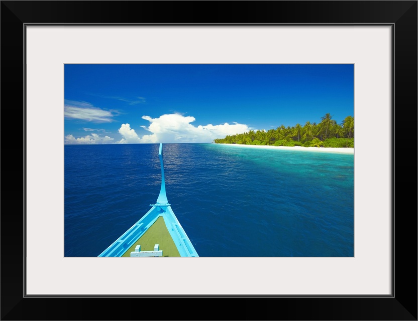 <p>Maldivian fishing boat (dhoni) and tropical island, Maldives, Indian Ocean, Asia</p>