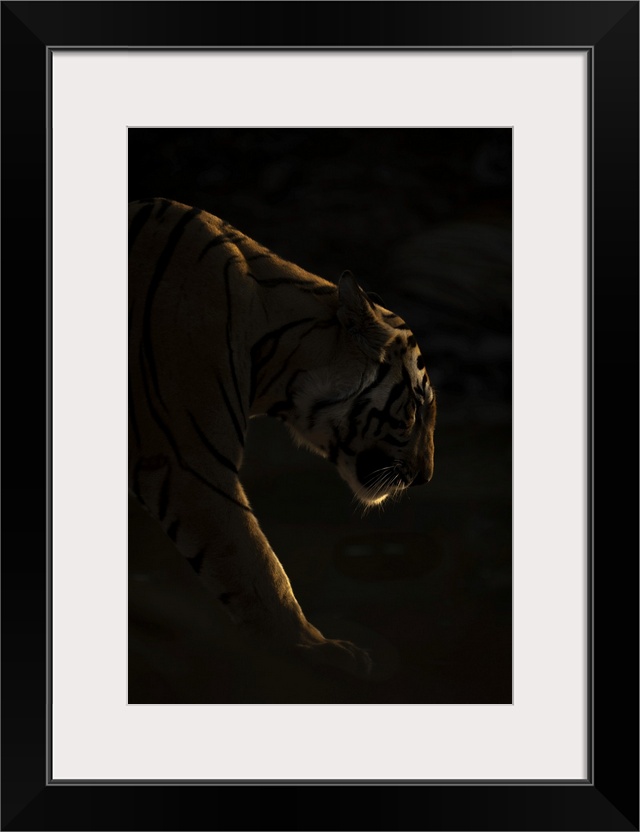 <p>Male Bengal tiger (Panthera tigris tigris) walks in darkness, lit by the setting sun. He has orange and black stripes with white patches on the head. Shot in Bandhavgarh National Park, India; Madhya Pradesh, India</p>