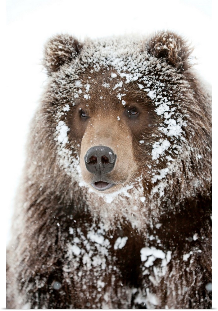 <p>Photograph of a large brown bear with his face framed by snow clinging to his shaggy fur. Perfect for a cabin or rustic docor scheme, or for anyone who loves wildlife and winter.</p>