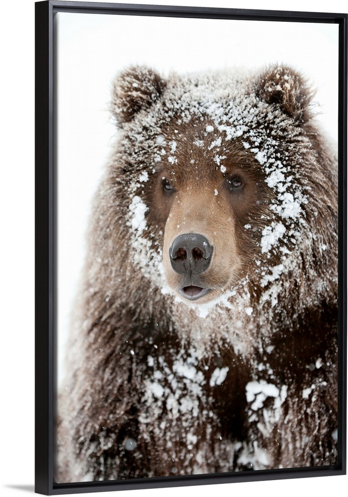 <p>Photograph of a large brown bear with his face framed by snow clinging to his shaggy fur. Perfect for a cabin or rustic docor scheme, or for anyone who loves wildlife and winter.</p>