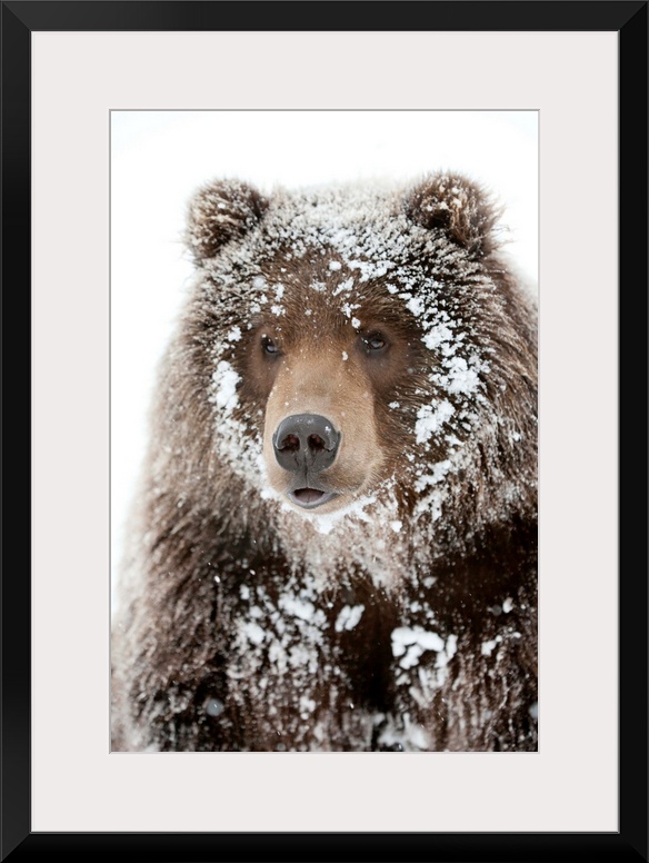 <p>Photograph of a large brown bear with his face framed by snow clinging to his shaggy fur. Perfect for a cabin or rustic docor scheme, or for anyone who loves wildlife and winter.</p>