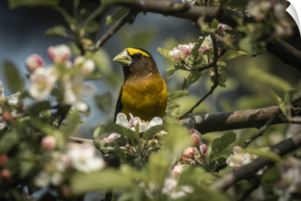 <p>Male Evening Grosbeak (Hesperiphona vespertina) perched among apple blossoms; Olympia, Washington, United States of America</p>