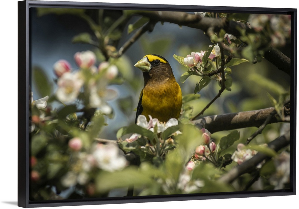 <p>Male Evening Grosbeak (Hesperiphona vespertina) perched among apple blossoms; Olympia, Washington, United States of America</p>