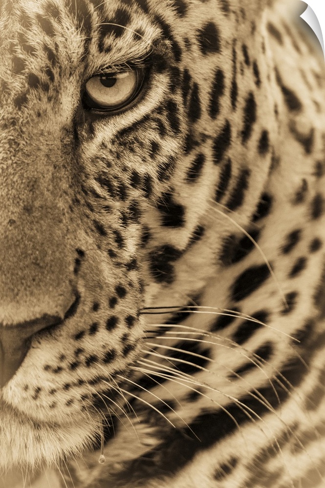 <p>A male leopard (Panthera pardus) stares at the camera. It has a brown, spotted coat, whiskers and a green eye, Masai Mara National Reserve; Kenya</p>