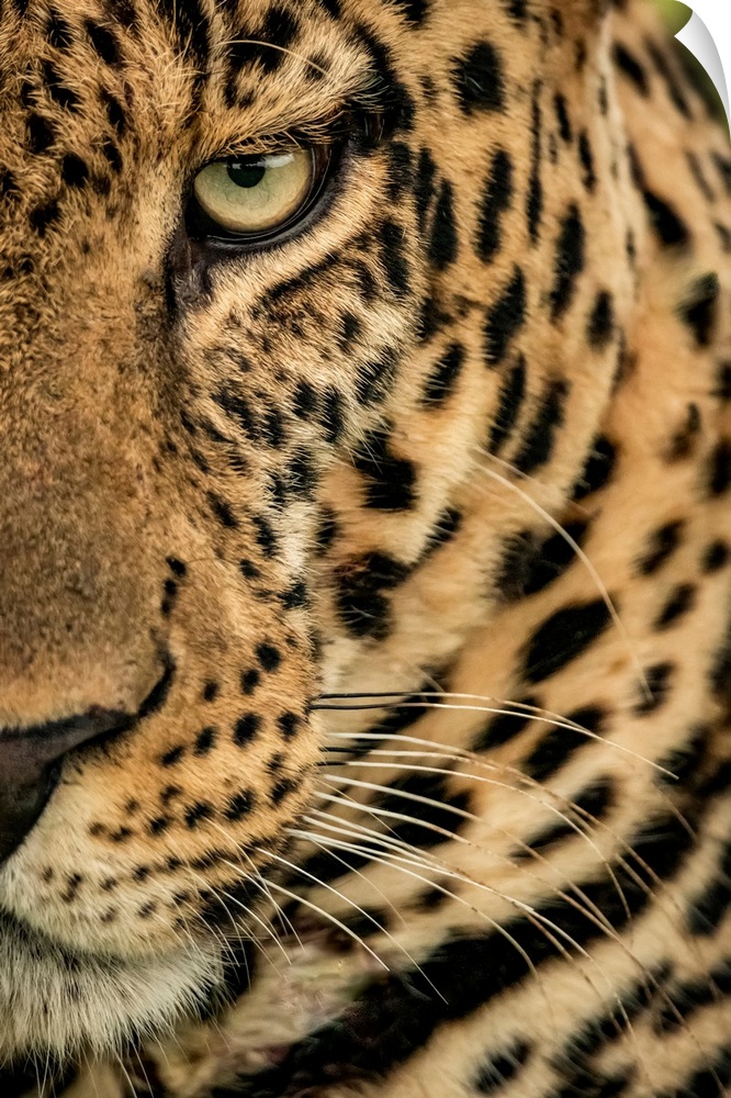 <p>Extreme close-up of a male leopard (panthera pardus) staring at the camera. It has a brown, spotted coat, whiskers and a green eye, cottar's 1920s safari camp, maasai mara national reserve, Kenya.</p>
