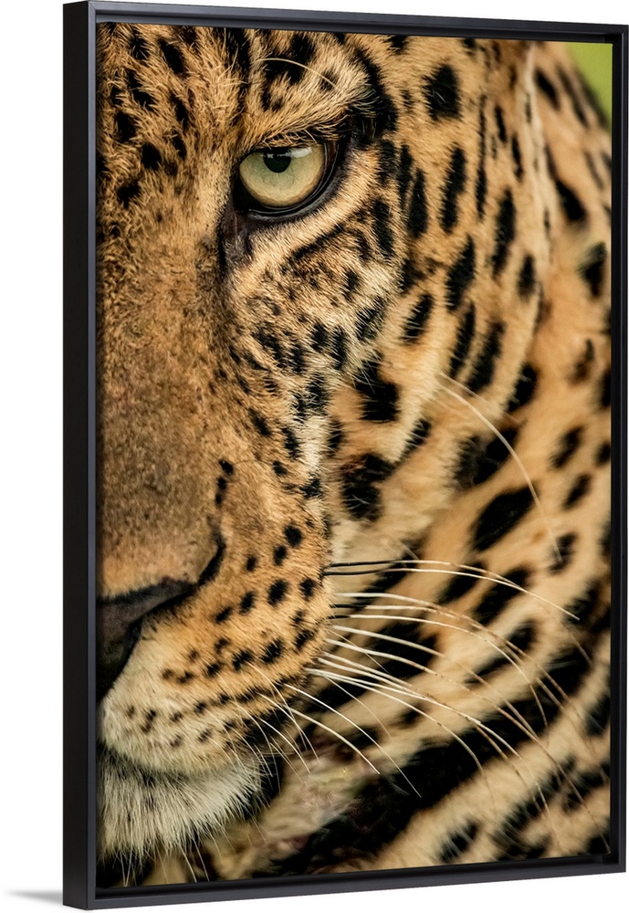 <p>Extreme close-up of a male leopard (panthera pardus) staring at the camera. It has a brown, spotted coat, whiskers and a green eye, cottar's 1920s safari camp, maasai mara national reserve, Kenya.</p>