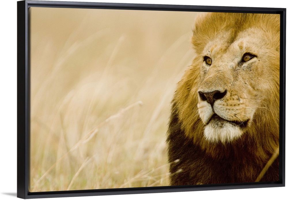 <p>Wall art of the up close view of a lion's head with a field in the background.</p>