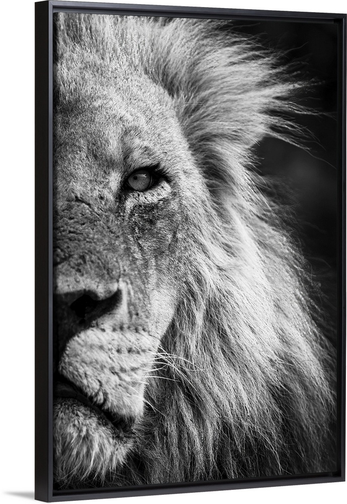 <p>Mono, close-up detail of half of a male lion face and head, (Panthera leo) portrait, in Chobe National Park, Chobe, Botswana</p>