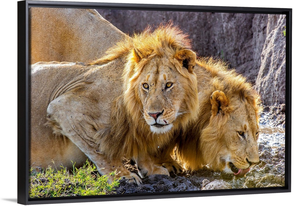 <p>Two male African Lions (Panthera leo) in the Masai Mara, Kenya, quenching their thirst after feeding on a wildebeest.</p>