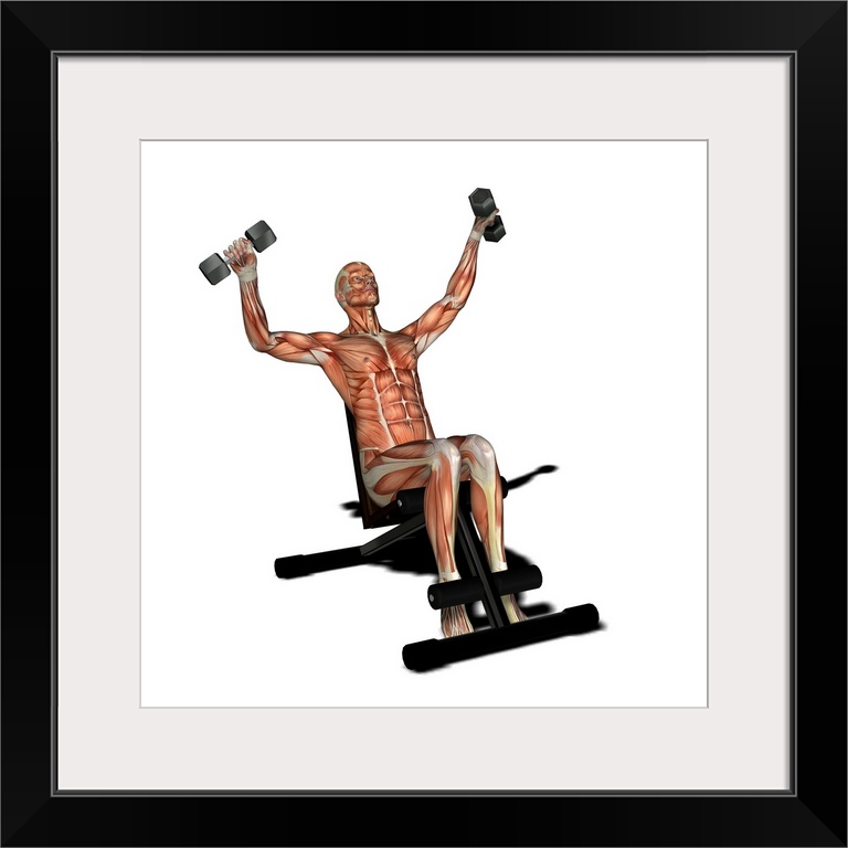 <p>Male muscles. Computer artwork showing the muscle structure of a man lifting weights. These are skeletal, or voluntary, muscles, which are under direct conscious control. When contracted or relaxed they pull on tendons, which are attached to the bones, causing movement.</p>