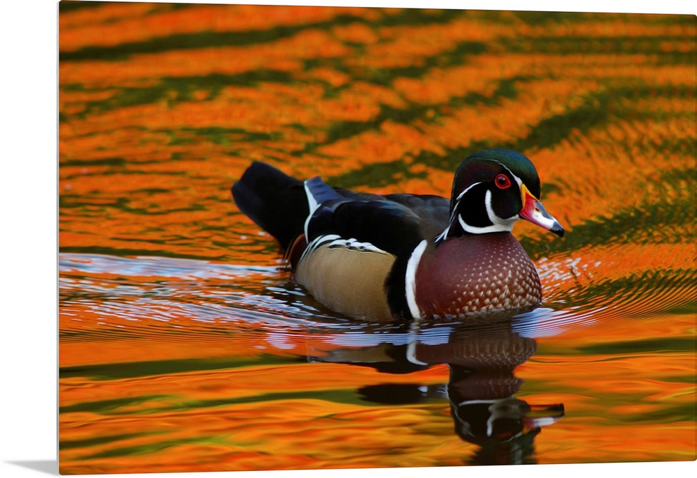 <p>Male wood duck, Aix sponsa, swimming. The water reflects fall foliage. Cambridge, Massachusetts.</p>