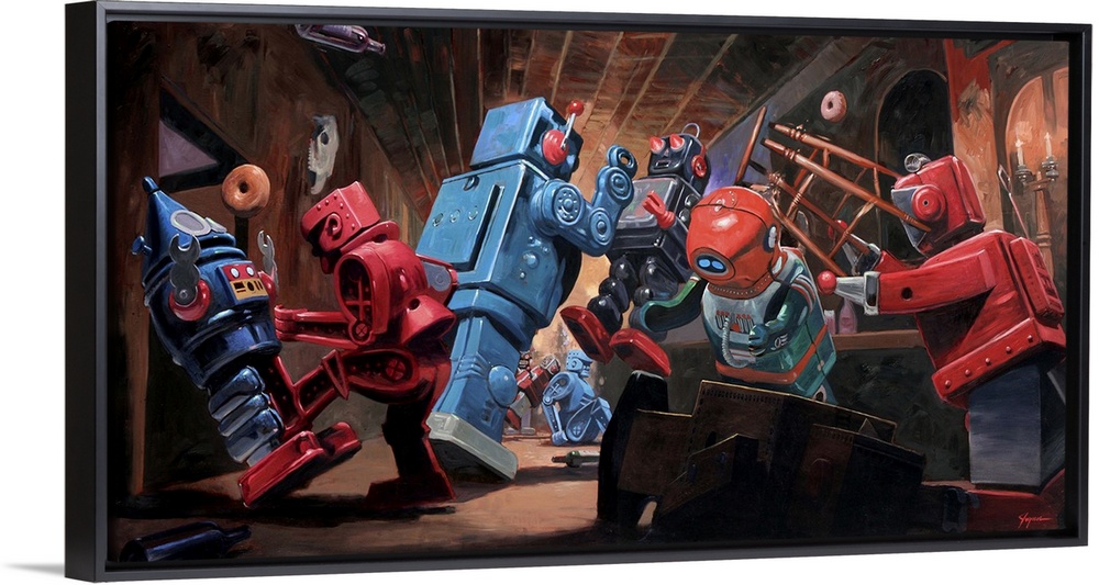 <p>A contemporary painting of a retro toy robot bar fight with chairs and donuts flying through the air.</p>