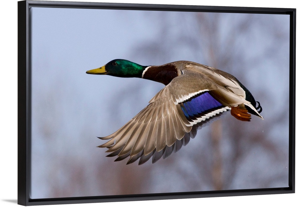 <p>A male wild duck mid-flight in front of a blurred background of trees.</p>