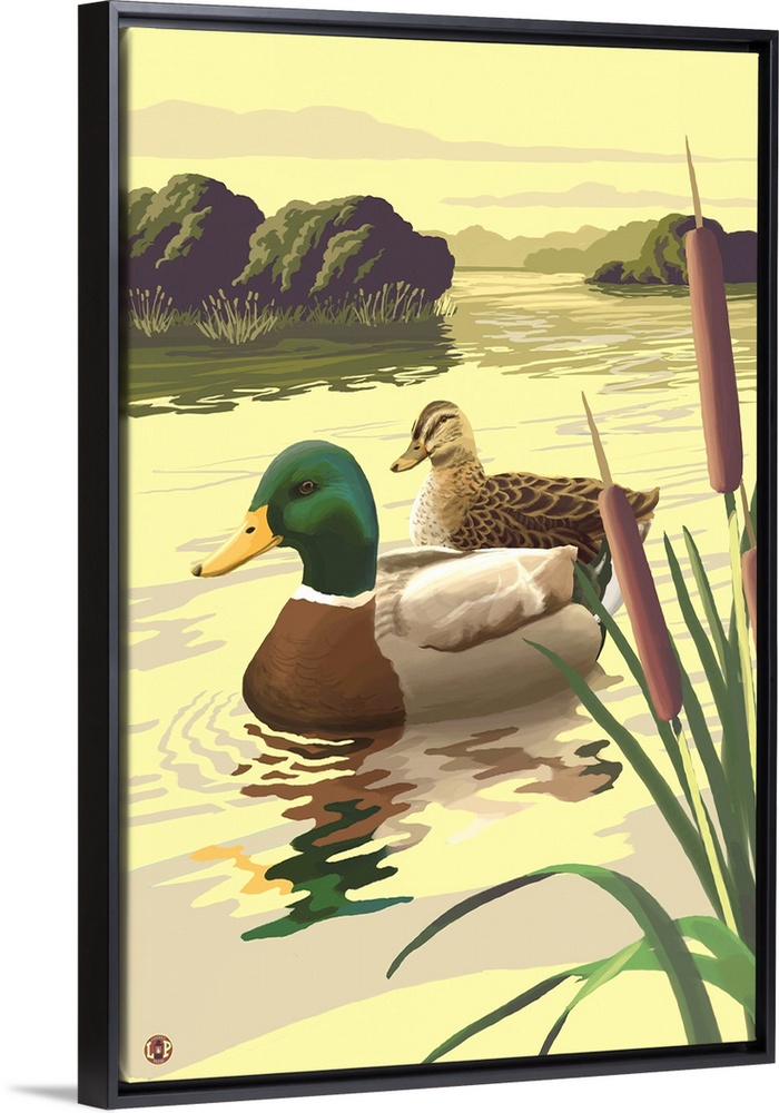 <p>Retro stylized art poster of a mallard couple on a lake.</p>