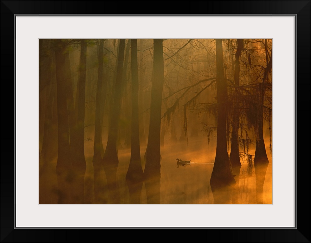 <p>A pair of mallard ducks swims, weaving in and out of large cypress trees, in a foggy water filled swamp as the sunlight comes streaming through the tree branches.</p>