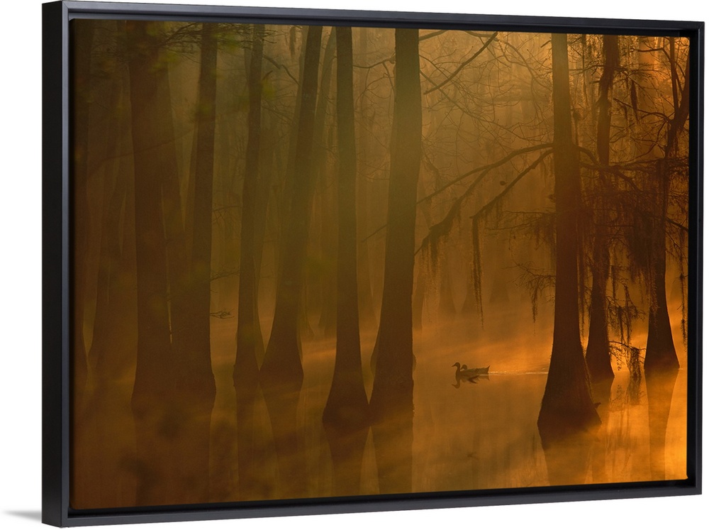 <p>A pair of mallard ducks swims, weaving in and out of large cypress trees, in a foggy water filled swamp as the sunlight comes streaming through the tree branches.</p>