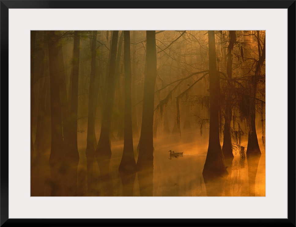 <p>A pair of mallard ducks swims, weaving in and out of large cypress trees, in a foggy water filled swamp as the sunlight comes streaming through the tree branches.</p>