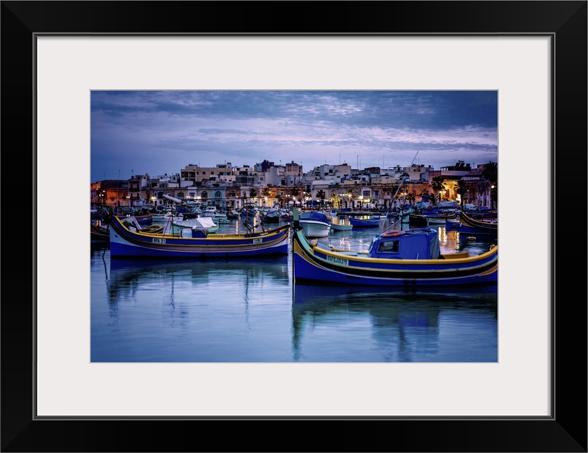 <p>Malta, Marsaxlokk, Mediterranean sea, Luzzu, traditional fishing boats and Marsaxlokk harbor at dusk.</p>