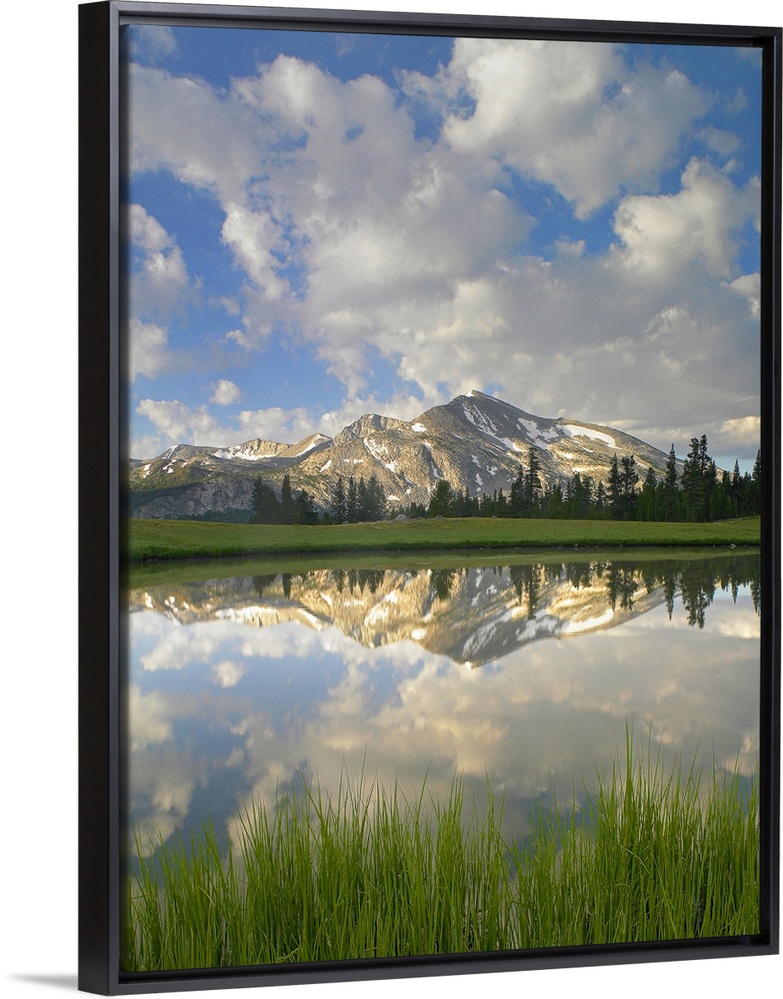 <p>Mammoth Peak and scattered clouds reflected in lake, Yosemite National Park, California</p>
