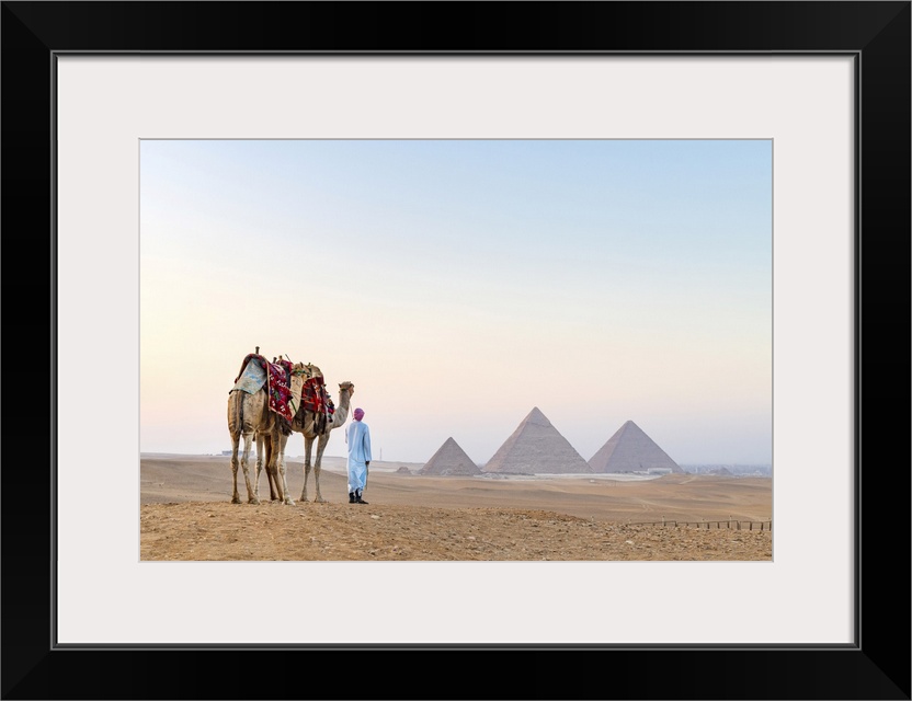 <p>Man and his camels at the Pyramids of Giza, Giza, Cairo, Egypt</p>