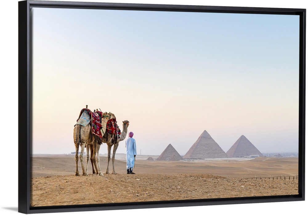 <p>Man and his camels at the Pyramids of Giza, Giza, Cairo, Egypt</p>