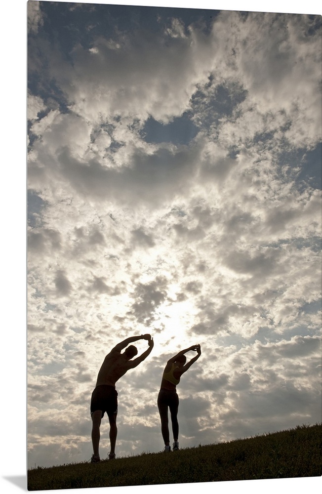 <p>Oversized, portrait photograph of a man and woman standing next to each other, stretching their arms and backs, silhouetted against a bright sky covered with thin, fluffy clouds.</p>
