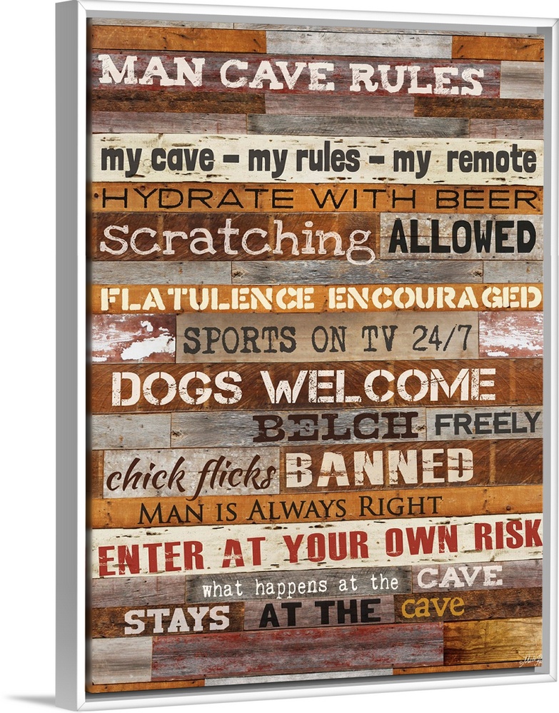 <p>Typography artwork of man cave rules, with text against a wooden background.</p>