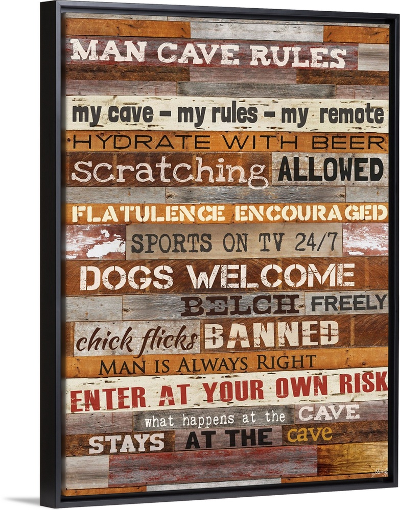 <p>Typography artwork of man cave rules, with text against a wooden background.</p>
