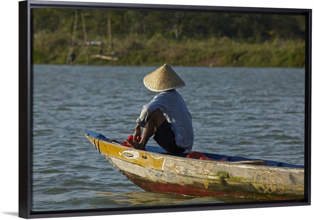 <p>Man fishing from boat on Thu Bon River, Hoi An (UNESCO World Heritage Site), Vietnam</p>