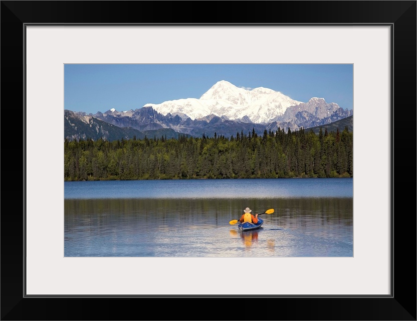 <p>A man paddles a Klepper kayak on Byers Lake, Denali State Park, Alaska. Mt. McKinley is in the background. August.</p>
