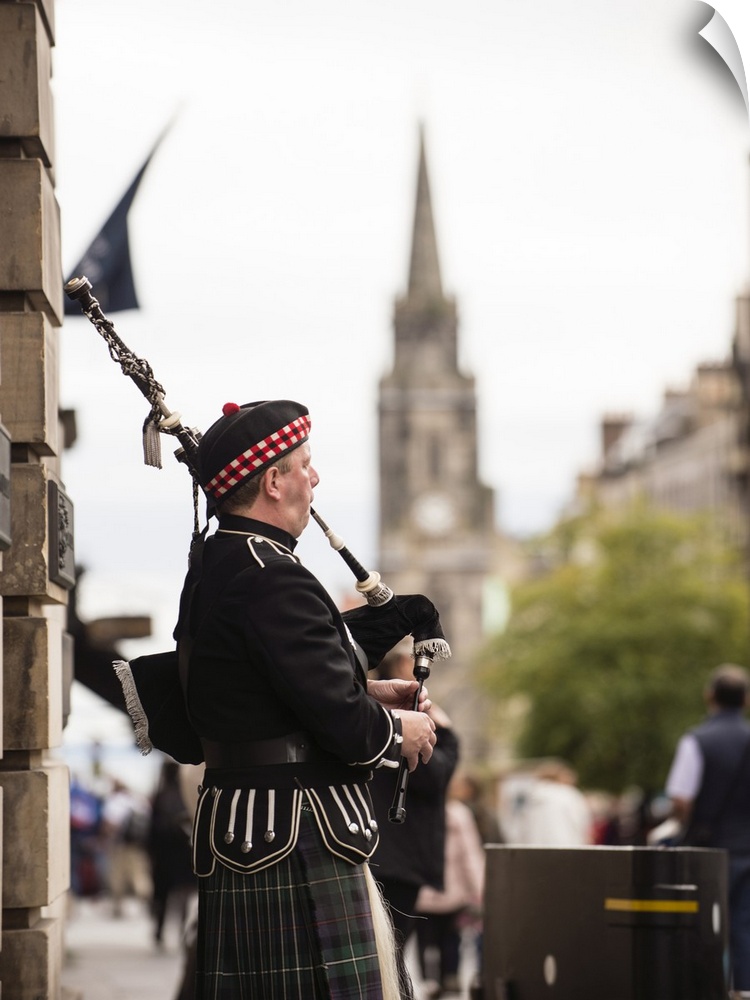 <p>Photograph of a man playing bagpipes in the city of Edinburgh, Scotland, UK.</p>