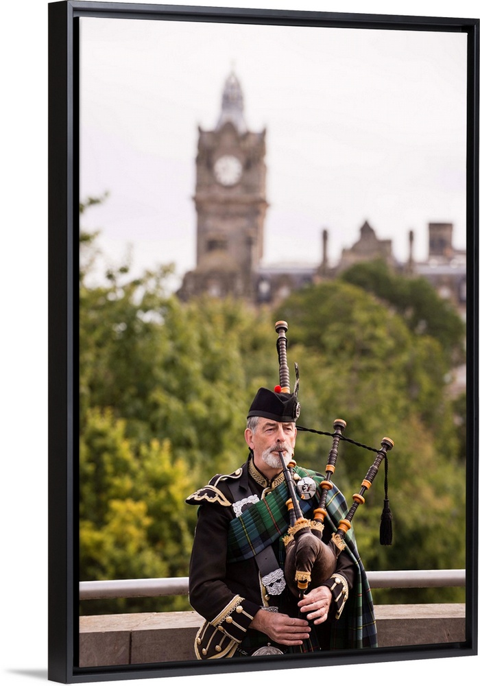 <p>Photograph of a man playing the bagpipes in Edinburgh with the clock tower blurred out in the background.</p>