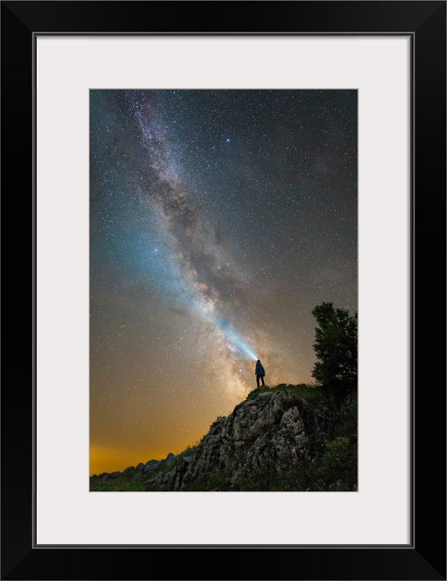 <p>Man shining a flashlight on the Milky Way from atop a mountain in Russia.</p>