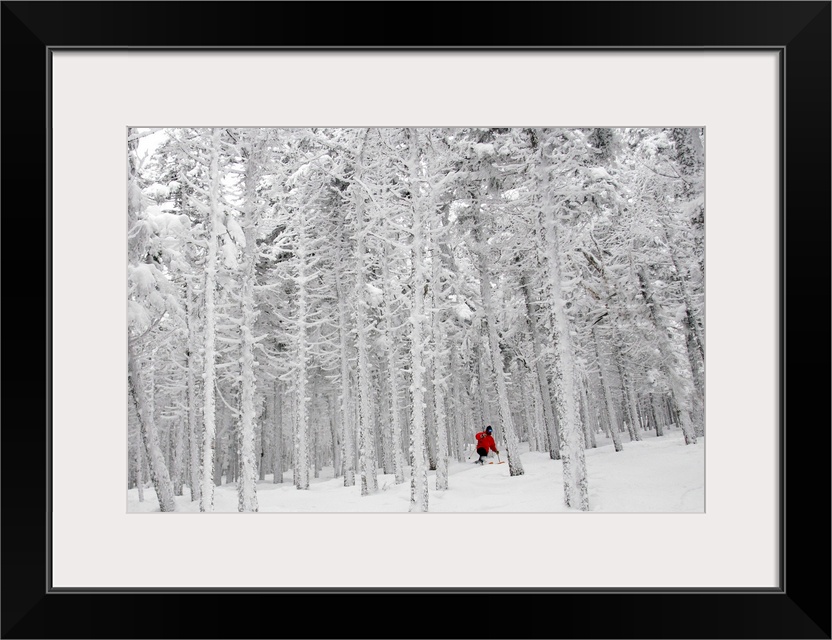 <p>Man Skiing through frost covered forest</p>