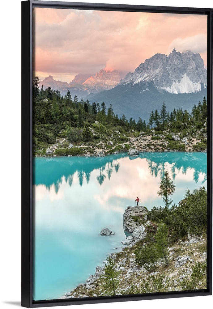 <p>Man standing at sunset at Lake Sorapiss, Sorapiss Lake, Dolomites, Veneto, Italy (MR).</p>