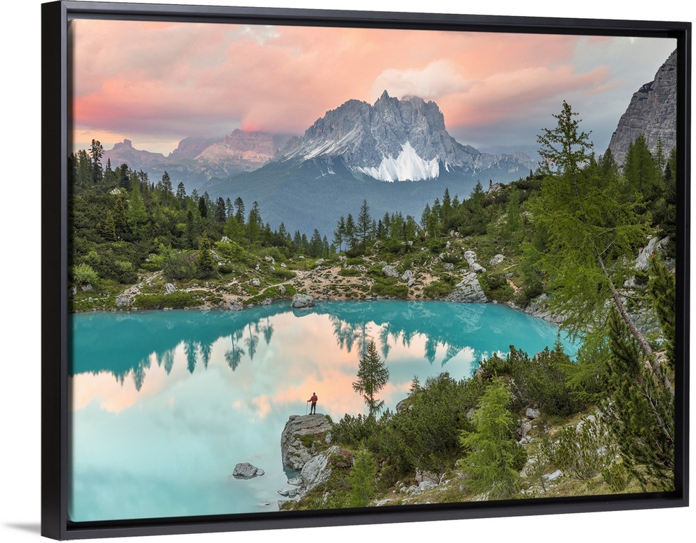 <p>Man standing at sunset at Lake Sorapiss, Sorapiss Lake, Dolomites, Veneto, Italy (MR).</p>